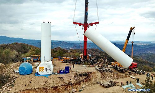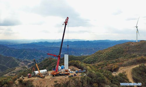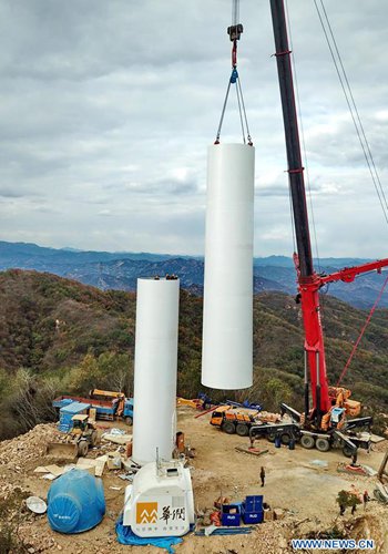 In this aerial photo taken on Oct. 10, 2018, workers assemble a turbine unit of a new wind power project near Changgou Village of Caonian Township in Qinglong Manchu Autonomous County, north China's Hebei Province. The project has an installed capacity of 100 megawatts, while its Annual Energy Production (AEP) is estimated at 224 million kilowatt-hours once it is in operation. (Xinhua/Yang Shiyao)