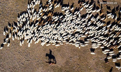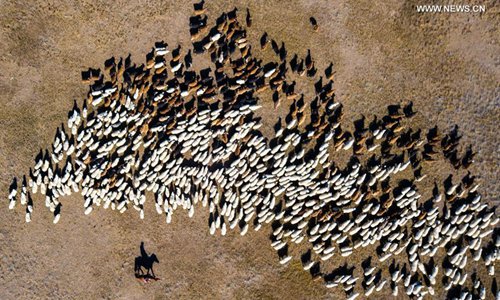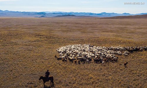 A Shepherd tends his sheep in Bayankhangai, Mongolia, on Oct. 10, 2018. (Xinhua/Bai Xueqi)