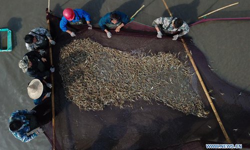 In this aerial photo taken on Oct. 12, 2018, workers collect netted freshwater shrimps at Fengshengwan fishery base in Balidian Township of Wuxing District, Huzhou, east China's Zhejiang Province. Staffs of the Fengshengwan fishery base are busy with their work in the fishing season for freshwater shrimps. (Xinhua/Huang Zongzhi)