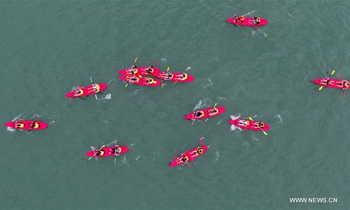 In this aerial photo taken on Oct. 14, 2018, people take part in a canoeing competition on the Liujiang River in Liuzhou, south China's Guangxi Zhuang Autonomous Region. The event ran from Saturday to Sunday and attracted some 500 canoe enthusiasts from home and abroad. (Xinhua/Li Hanchi)