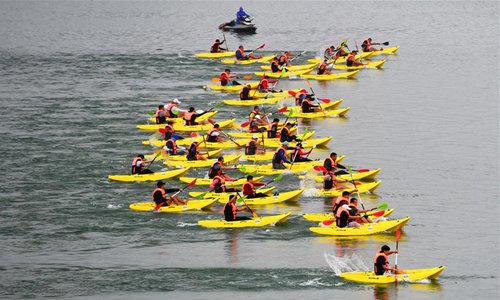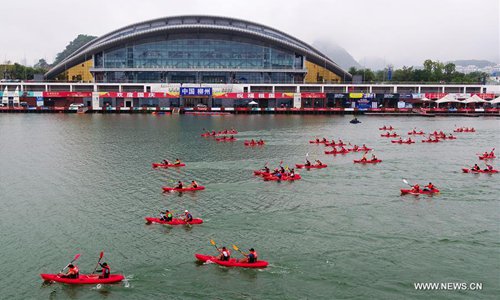 People take part in a canoeing competition on the Liujiang River in Liuzhou, south China's Guangxi Zhuang Autonomous Region, Oct. 14, 2018. The event ran from Saturday to Sunday and attracted some 500 canoe enthusiasts from home and abroad. (Xinhua/Li Hanchi)