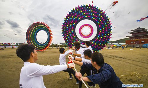 Competitors fly a big kite at a kite flying contest held at Lulanqingsha scenic spot in Daishan County of Zhoushan, east China's Zhejiang Province, Oct. 14, 2018. (Xinhua/Yao Feng)