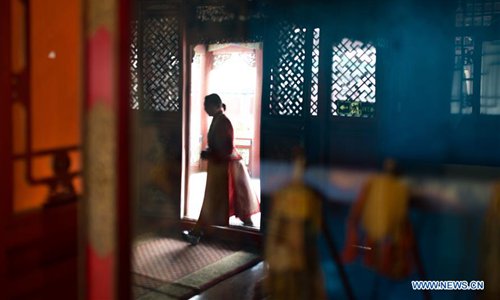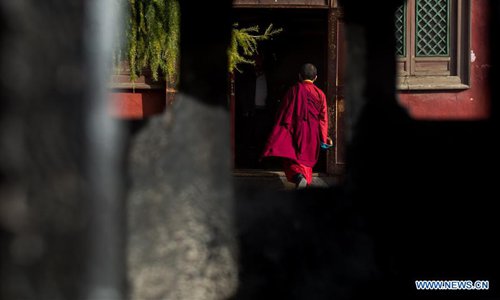 A Lama walks into a temple in Ulan Bator, Mongolia, on Oct. 9, 2018. (Xinhua/Bai Xueqi)