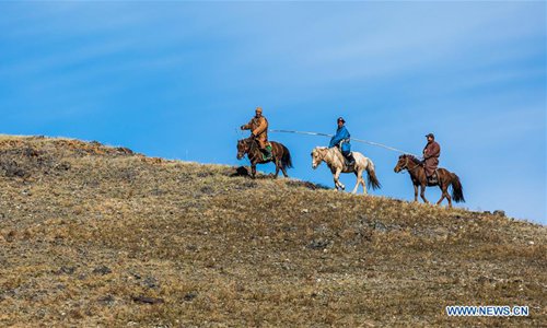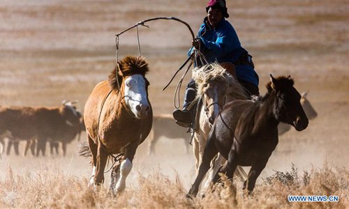 Local herdsmen prepares to lasso horses in Bayankhangai, Mongolia, on Oct. 10, 2018. (Xinhua/Bai Xueqi)