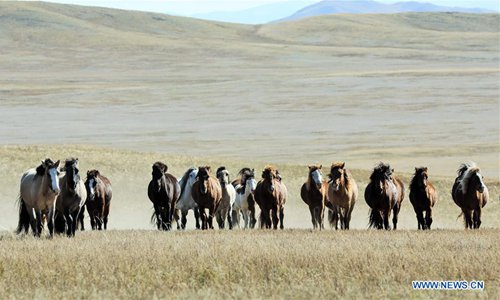 Horses run on grassland in Bayankhangai, Mongolia, on Oct. 10, 2018. (Xinhua/Asigang)