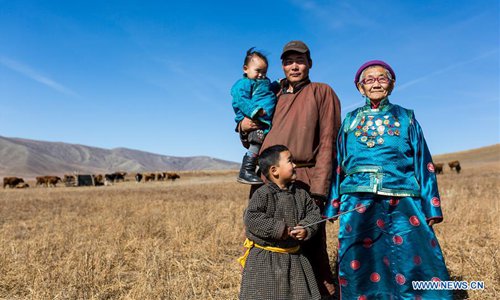 Local shepherds pose for photo in Bayankhangai, Mongolia, on Oct. 10, 2018. (Xinhua/Bai Xueqi)