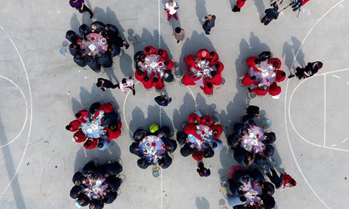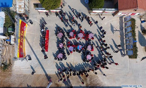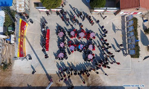 Aerial photo taken on Oct. 13, 2018 shows seniors attending a banquet celebrating the Chongyang Festival, a day to pay respect to seniors, in Shuichi Village of Huguan County, north China's Shanxi Province, Oct. 13, 2018. About 164 people, out of the total number of over 400 residents in the Village, used to live under poverty line due to lack of natural resources. Most young people decided to leave the village. Since 2017, pig farms, vegetable greenhouses and photovoltaic power stations have been established in Shuichi Village to promote accurate poverty alleviation. Over the year the village was lifted out of poverty, with an average annual personal income of 4,000 yuan (578 US dollars). Villagers decided to take a group picture of seniors in the village to mark this unique moment of poverty alleviation on the Chongyang Festival.(Xinhua/Zhan Yan)