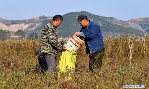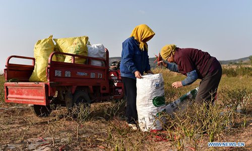 Villagers pack chilies in Shuichi Village of Huguan County, north China's Shanxi Province, Oct. 11, 2018. About 164 people, out of the total number of over 400 residents in the Village, used to live under poverty line due to lack of natural resources. Most young people decided to leave the village. Since 2017, pig farms, vegetable greenhouses and photovoltaic power stations have been established in Shuichi Village to promote accurate poverty alleviation. Over the year the village was lifted out of poverty, with an average annual personal income of 4,000 yuan (578 US dollars). Villagers decided to take a group picture of seniors in the village to mark this unique moment of poverty alleviation on the Chongyang Festival, a day to pay respect to seniors. (Xinhua/Zhan Yan)