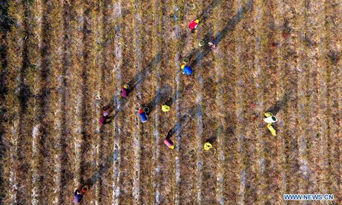 Aerial photo taken on Oct. 11, 2018 shows villagers packing chilies in Shuichi Village of Huguan County, north China's Shanxi Province. About 164 people, out of the total number of over 400 residents in the Village, used to live under poverty line due to lack of natural resources. Most young people decided to leave the village. Since 2017, pig farms, vegetable greenhouses and photovoltaic power stations have been established in Shuichi Village to promote accurate poverty alleviation. Over the year the village was lifted out of poverty, with an average annual personal income of 4,000 yuan (578 US dollars). Villagers decided to take a group picture of seniors in the village to mark this unique moment of poverty alleviation on the Chongyang Festival, a day to pay respect to seniors.(Xinhua/Zhan Yan)