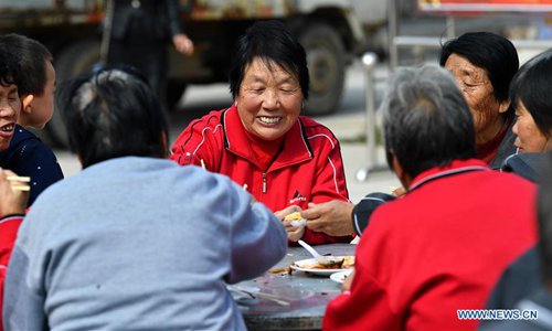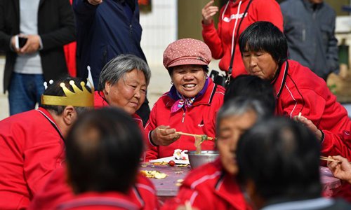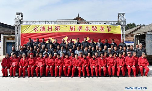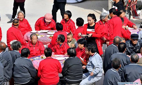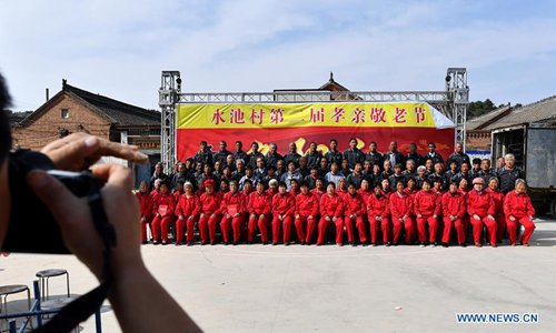 Seniors attends a banquet celebrating the Chongyang Festival, a day to pay respect to seniors, in Shuichi Village of Huguan County, north China's Shanxi Province, Oct. 13, 2018. About 164 people, out of the total number of over 400 residents in the Village, used to live under poverty line due to lack of natural resources. Most young people decided to leave the village. Since 2017, pig farms, vegetable greenhouses and photovoltaic power stations have been established in Shuichi Village to promote accurate poverty alleviation. Over the year the village was lifted out of poverty, with an average annual personal income of 4,000 yuan (578 US dollars). Villagers decided to take a group picture of seniors in the village to mark this unique moment of poverty alleviation on the Chongyang Festival. (Xinhua/Zhan Yan)
