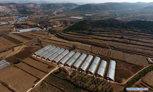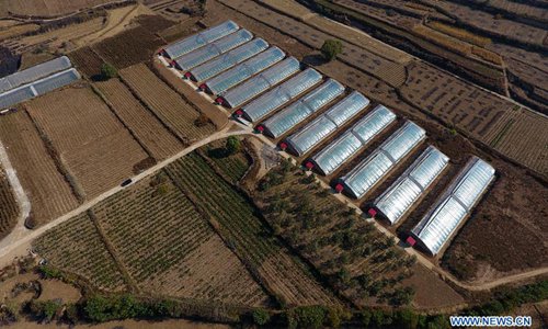 Aerial photo taken on Oct. 12, 2018 shows the vegetable greenhouse in Shuichi Village of Huguan County, north China's Shanxi Province. About 164 people, out of the total number of over 400 residents in the Village, used to live under poverty line due to lack of natural resources. Most young people decided to leave the village. Since 2017, pig farms, vegetable greenhouses and photovoltaic power stations have been established in Shuichi Village to promote accurate poverty alleviation. Over the year the village was lifted out of poverty, with an average annual personal income of 4,000 yuan (578 US dollars). Villagers decided to take a group picture of seniors in the village to mark this unique moment of poverty alleviation on the Chongyang Festival, a day to pay respect to seniors.(Xinhua/Zhan Yan)