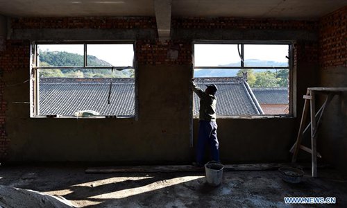 A man works at the construction site of a daycare center for seniors in Shuichi Village of Huguan County, north China's Shanxi Province, Oct. 11, 2018. About 164 people, out of the total number of over 400 residents in the Village, used to live under poverty line due to lack of natural resources. Most young people decided to leave the village. Since 2017, pig farms, vegetable greenhouses and photovoltaic power stations have been established in Shuichi Village to promote accurate poverty alleviation. Over the year the village was lifted out of poverty, with an average annual personal income of 4,000 yuan (578 US dollars). Villagers decided to take a group picture of seniors in the village to mark this unique moment of poverty alleviation on the Chongyang Festival, a day to pay respect to seniors. (Xinhua/Zhan Yan)