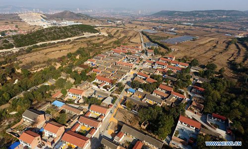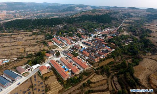 Aerial photo taken on Oct. 14, 2018 shows the Shuichi Village of Huguan County, north China's Shanxi Province. About 164 people, out of the total number of over 400 residents in the Village, used to live under poverty line due to lack of natural resources. Most young people decided to leave the village. Since 2017, pig farms, vegetable greenhouses and photovoltaic power stations have been established in Shuichi Village to promote accurate poverty alleviation. Over the year the village was lifted out of poverty, with an average annual personal income of 4,000 yuan (578 US dollars). Villagers decided to take a group picture of seniors in the village to mark this unique moment of poverty alleviation on the Chongyang Festival, a day to pay respect to seniors. (Xinhua/Zhan Yan)