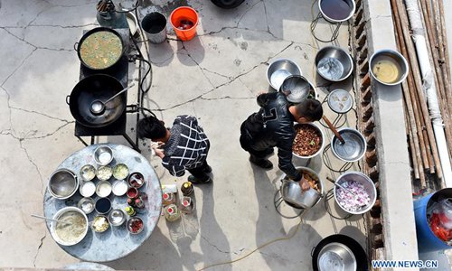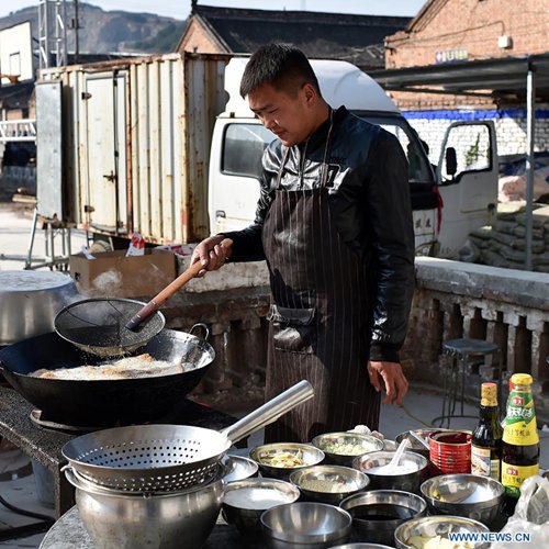 A cook prepares meals for seniors to celebrate the Chongyang Festival, a day to pay respect to seniors, in Shuichi Village of Huguan County, north China's Shanxi Province, Oct. 13, 2018. About 164 people, out of the total number of over 400 residents in the Village, used to live under poverty line due to lack of natural resources. Most young people decided to leave the village. Since 2017, pig farms, vegetable greenhouses and photovoltaic power stations have been established in Shuichi Village to promote accurate poverty alleviation. Over the year the village was lifted out of poverty, with an average annual personal income of 4,000 yuan (578 US dollars). Villagers decided to take a group picture of seniors in the village to mark this unique moment of poverty alleviation on the Chongyang Festival. (Xinhua/Zhan Yan)