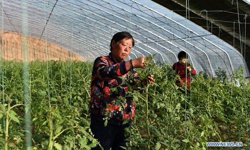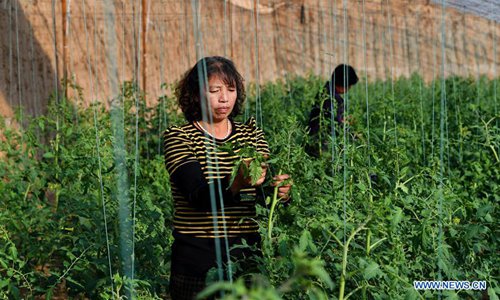 Villagers work in a vegetable greenhouse in Shuichi Village of Huguan County, north China's Shanxi Province, Oct. 12, 2018. About 164 people, out of the total number of over 400 residents in the Village, used to live under poverty line due to lack of natural resources. Most young people decided to leave the village. Since 2017, pig farms, vegetable greenhouses and photovoltaic power stations have been established in Shuichi Village to promote accurate poverty alleviation. Over the year the village was lifted out of poverty, with an average annual personal income of 4,000 yuan (578 US dollars). Villagers decided to take a group picture of seniors in the village to mark this unique moment of poverty alleviation on the Chongyang Festival, a day to pay respect to seniors.(Xinhua/Zhan Yan)