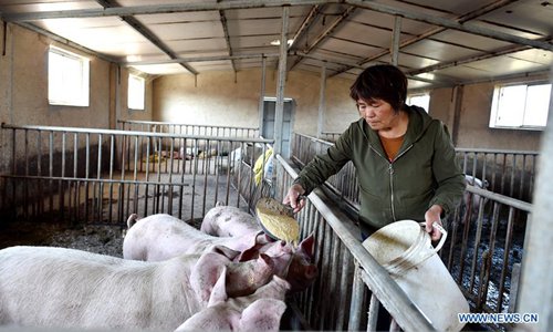 A villager feeds pigs at a pig farm in Shuichi Village of Huguan County, north China's Shanxi Province, Oct. 12, 2018. About 164 people, out of the total number of over 400 residents in the Village, used to live under poverty line due to lack of natural resources. Most young people decided to leave the village. Since 2017, pig farms, vegetable greenhouses and photovoltaic power stations have been established in Shuichi Village to promote accurate poverty alleviation. Over the year the village was lifted out of poverty, with an average annual personal income of 4,000 yuan (578 US dollars). Villagers decided to take a group picture of seniors in the village to mark this unique moment of poverty alleviation on the Chongyang Festival, a day to pay respect to seniors.(Xinhua/Zhan Yan)