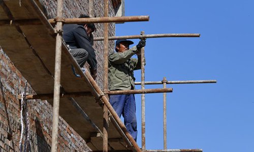 People work at the construction site of a daycare center for seniors in Shuichi Village of Huguan County, north China's Shanxi Province, Oct. 12, 2018. About 164 people, out of the total number of over 400 residents in the Village, used to live under poverty line due to lack of natural resources. Most young people decided to leave the village. Since 2017, pig farms, vegetable greenhouses and photovoltaic power stations have been established in Shuichi Village to promote accurate poverty alleviation. Over the year the village was lifted out of poverty, with an average annual personal income of 4,000 yuan (578 US dollars). Villagers decided to take a group picture of seniors in the village to mark this unique moment of poverty alleviation on the Chongyang Festival, a day to pay respect to seniors.(Xinhua/Zhan Yan)