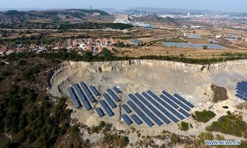 Aerial photo taken on Oct. 12, 2018 shows the photovoltaic power station in Shuichi Village of Huguan County, north China's Shanxi Province. About 164 people, out of the total number of over 400 residents in the Village, used to live under poverty line due to lack of natural resources. Most young people decided to leave the village. Since 2017, pig farms, vegetable greenhouses and photovoltaic power stations have been established in Shuichi Village to promote accurate poverty alleviation. Over the year the village was lifted out of poverty, with an average annual personal income of 4,000 yuan (578 US dollars). Villagers decided to take a group picture of seniors in the village to mark this unique moment of poverty alleviation on the Chongyang Festival, a day to pay respect to seniors. (Xinhua/Zhan Yan)