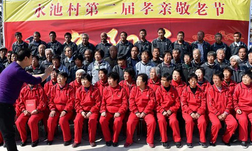 A photographer takes group photos of seniors in Shuichi Village of Huguan County, north China's Shanxi Province, Oct. 13, 2018. About 164 people, out of the total number of over 400 residents in the Village, used to live under poverty line due to lack of natural resources. Most young people decided to leave the village. Since 2017, pig farms, vegetable greenhouses and photovoltaic power stations have been established in Shuichi Village to promote accurate poverty alleviation. Over the year the village was lifted out of poverty, with an average annual personal income of 4,000 yuan (578 US dollars). Villagers decided to take a group picture of seniors in the village to mark this unique moment of poverty alleviation on the Chongyang Festival, a day to pay respect to seniors.(Xinhua/Zhan Yan)