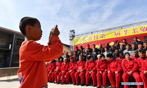A child takes photos of seniors in Shuichi Village of Huguan County, north China's Shanxi Province, Oct. 13, 2018. About 164 people, out of the total number of over 400 residents in the Village, used to live under poverty line due to lack of natural resources. Most young people decided to leave the village. Since 2017, pig farms, vegetable greenhouses and photovoltaic power stations have been established in Shuichi Village to promote accurate poverty alleviation. Over the year the village was lifted out of poverty, with an average annual personal income of 4,000 yuan (578 US dollars). Villagers decided to take a group picture of seniors in the village to mark this unique moment of poverty alleviation on the Chongyang Festival, a day to pay respect to seniors. (Xinhua/Zhan Yan)