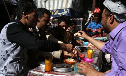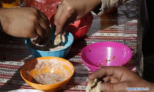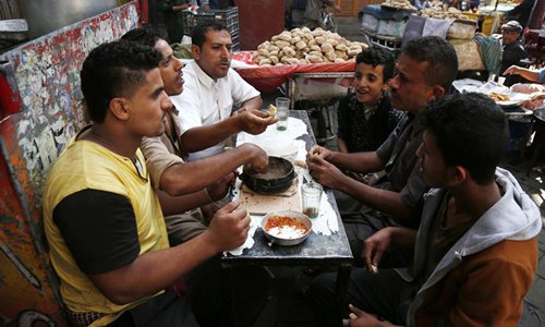 Yemeni people get their breakfast at a popular restaurant in Sanaa, Yemen, on Oct. 16, 2018. World Food Day is celebrated every year on Oct. 16 to commemorate the founding of the UN Food and Agriculture Organization in 1945. (Xinhua/Mohammed Mohammed)