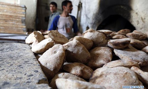 Yemeni men buy bread from a baker in Sanaa, Yemen, on Oct. 16, 2018. World Food Day is celebrated every year on Oct. 16 to commemorate the founding of the UN Food and Agriculture Organization in 1945. (Xinhua/Mohammed Mohammed)