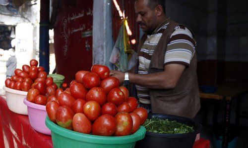 A Yemeni seller displays tomato for sale at a popular market in Sanaa, Yemen, on Oct. 16, 2018. World Food Day is celebrated every year on Oct. 16 to commemorate the founding of the UN Food and Agriculture Organization in 1945. (Xinhua/Mohammed Mohammed)