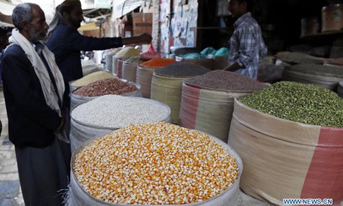 Yemeni people buy grains at a popular market in Sanaa, Yemen, on Oct. 16, 2018. World Food Day is celebrated every year on Oct. 16 to commemorate the founding of the UN Food and Agriculture Organization in 1945. (Xinhua/Mohammed Mohammed)