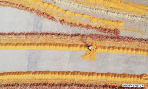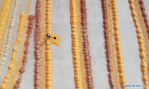 Aerial photo taken on Oct. 16, 2018 shows a villager stir corn grains for drying in Tancheng County of Linyi, east China's Shandong Province. World Food Day is celebrated every year on Oct. 16 to commemorate the founding of the UN Food and Agriculture Organization in 1945. (Xinhua/Zhang Chunlei)