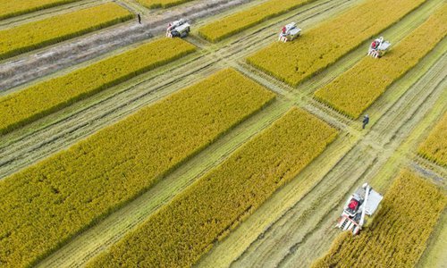 Aerial photo taken on Oct. 16, 2018 shows reapers harvest rice in the fields in Nantong, east China's Jiangsu Province. World Food Day is celebrated every year on Oct. 16 to commemorate the founding of the UN Food and Agriculture Organization in 1945. (Xinhua/Xu Jinbai)