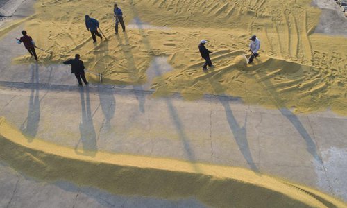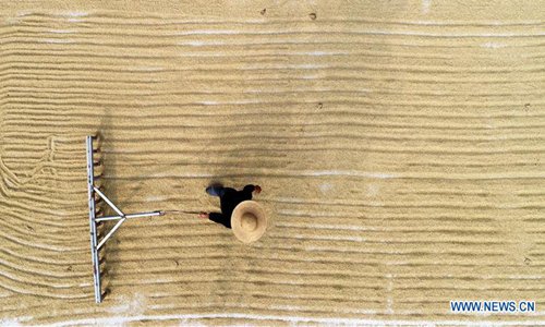 Aerial photo taken on Oct. 16, 2018 shows villagers stir rice grains for drying at a farm in Nantong, east China's Jiangsu Province. World Food Day is celebrated every year on Oct. 16 to commemorate the founding of the UN Food and Agriculture Organization in 1945. (Xinhua/Xu Jinbai)