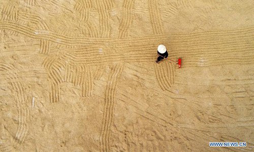 Aerial photo taken on Oct. 16, 2018 shows a villager stir rice grains for drying in Tancheng County of Linyi, east China's Shandong Province. World Food Day is celebrated every year on Oct. 16 to commemorate the founding of the UN Food and Agriculture Organization in 1945. (Xinhua/Zhang Chunlei)