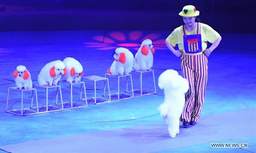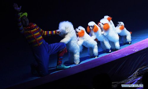 A performer tames dogs during the International Acrobatics Art Festival in Puyang, central China's Henan Procvince, Oct. 16, 2018. The week-long event kicked off here Tuesday. (Xinhua/Zhu Xiang)