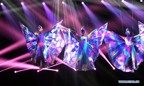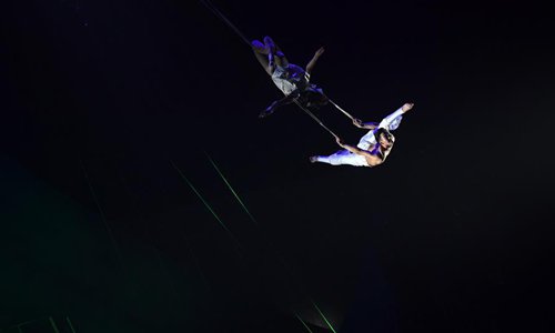 Acrobats perform during the International Acrobatics Art Festival in Puyang, central China's Henan Procvince, Oct. 16, 2018. The week-long event kicked off here Tuesday. (Xinhua/Zhu Xiang)