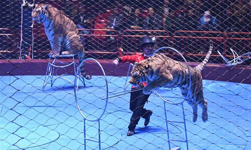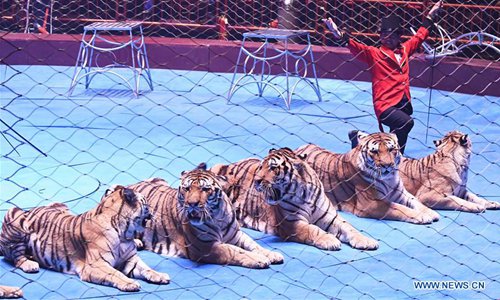 A performer tames tigers during the International Acrobatics Art Festival in Puyang, central China's Henan Procvince, Oct. 16, 2018. The week-long event kicked off here Tuesday. (Xinhua/Zhu Xiang)