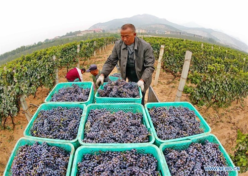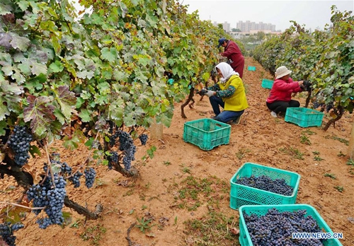 Farmers pick wine grapes at a planting base in Liangshan Township of Changli County, north China's Hebei Province, Oct. 21, 2018. Over 50,000 mu (about 3,333.33 hectares) of wine grapes have entered the harvest season. The annual output value of local wine brewing industry has reached 2.5 billion yuan (361.1 million U.S. dollars). (Xinhua/Yang Shiyao)