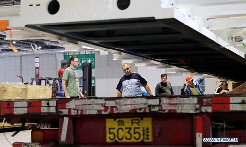 German engineer Martin Holzheid (C) checks the position of a key component of Taurus milling machine in Shanghai, east China, Oct. 22, 2018. Preliminary assembly of the milling machine, which will be the largest exhibit to be on show at China's upcoming import expo, was finished here on Monday. The exhibit is expected to cover 200 square meters of exhibiting space during the expo, which is scheduled to be held in Shanghai on Nov. 5-10. (Xinhua/Fang Zhe)