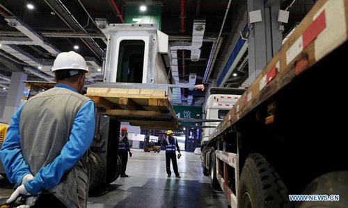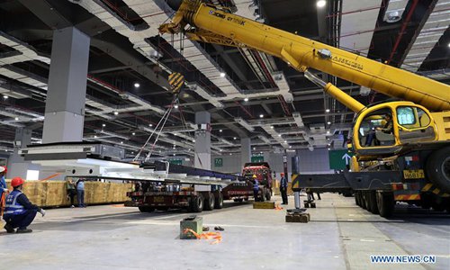 Workers lift the components of Taurus milling machine in Shanghai, east China, Oct. 22, 2018. Preliminary assembly of the milling machine, which will be the largest exhibit to be on show at China's upcoming import expo, was finished here on Monday. The exhibit is expected to cover 200 square meters of exhibiting space during the expo, which is scheduled to be held in Shanghai on Nov. 5-10. (Xinhua/Fang Zhe)