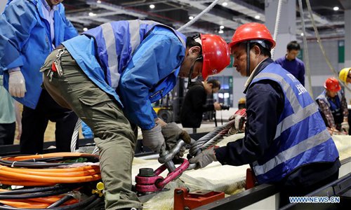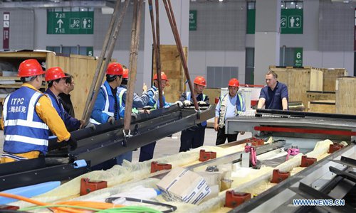 Staff members work at the assembly site of Taurus milling machine in Shanghai, east China, Oct. 17, 2018. Preliminary assembly of the milling machine, which will be the largest exhibit to be on show at China's upcoming import expo, was finished here on Monday. The exhibit is expected to cover 200 square meters of exhibiting space during the expo, which is scheduled to be held in Shanghai on Nov. 5-10. (Xinhua/Fang Zhe)