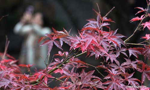 A tourist views maple leaves at a park in Yangzhou, east China's Jiangsu Province, Oct. 22, 2018. (Xinhua/Meng Delong)