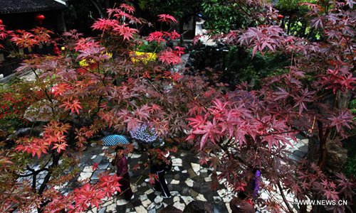 Tourists view maple leaves at a park in Yangzhou, east China's Jiangsu Province, Oct. 22, 2018. (Xinhua/Meng Delong)