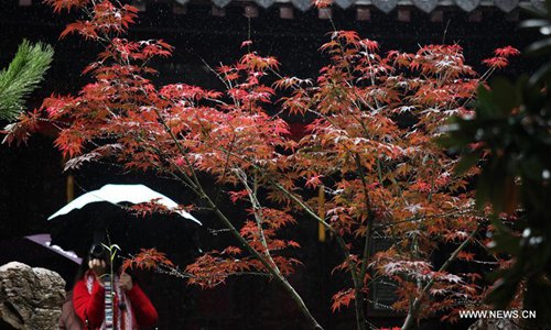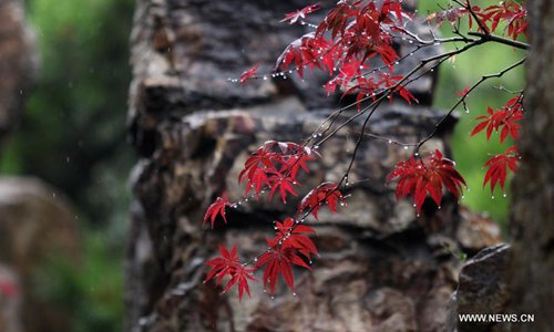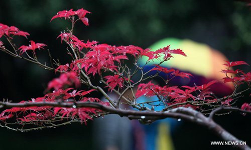 Photo shows raindrops on maple leaves at a park in Yangzhou, east China's Jiangsu Province, Oct. 22, 2018. (Xinhua/Meng Delong)