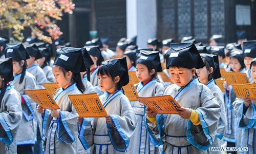 Students learn traditional etiquette at a pramiry school in Changxing County, east China's Zhejiang Province, Oct. 23, 2018. (Xinhua/Xu Yu)