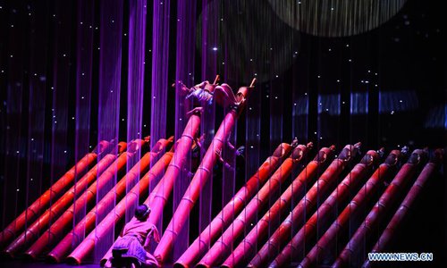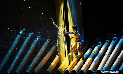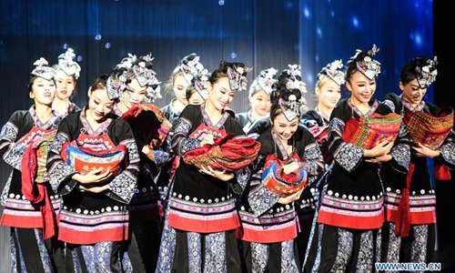 Actors from Liuzhou art theatre perform a dancing drama named "Dong" at Guiyang, capital of southwest China's Guizhou Province, Oct. 22, 2018. (Xinhua/Tao Liang)