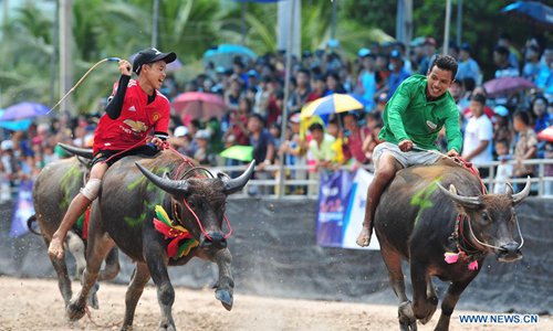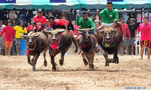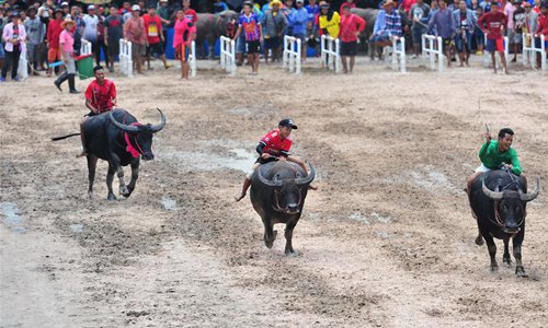 Racers compete during the buffalo racing in Chonburi, Thailand, Oct. 23, 2018. Hundreds of buffaloes took part in the centuries-old buffalo racing festival held annually in October among rice farmers to celebrate the rice harvest. (Xinhua/Rachen Sageamsak)