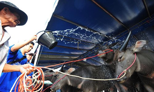 A man splashes water for buffalo before the buffalo racing in Chonburi, Thailand, Oct. 23, 2018. Hundreds of buffaloes took part in the centuries-old buffalo racing festival held annually in October among rice farmers to celebrate the rice harvest. (Xinhua/Rachen Sageamsak)
