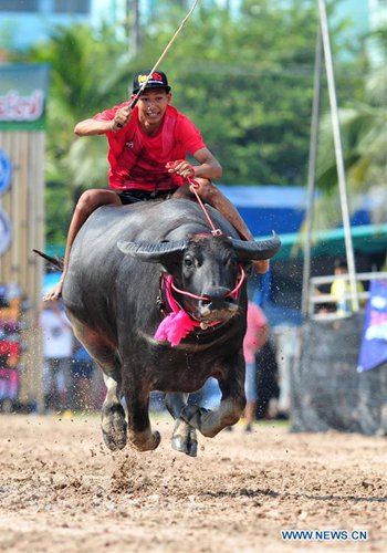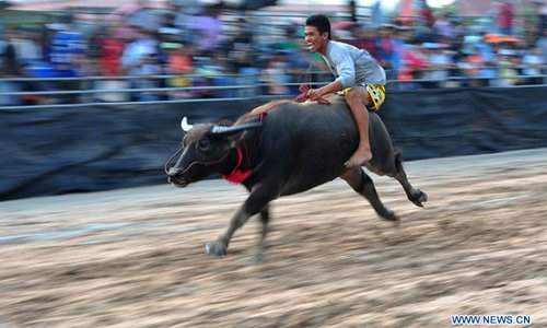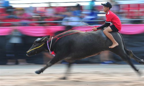 A racer competes during the buffalo racing in Chonburi, Thailand, Oct. 23, 2018. Hundreds of buffaloes took part in the centuries-old buffalo racing festival held annually in October among rice farmers to celebrate the rice harvest. (Xinhua/Rachen Sageamsak)