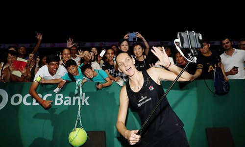 Karolina Pliskova takes a selfie with fans after her win over Petra Kvitova at the WTA Finals in Singapore on Thursday. Photo: VCG