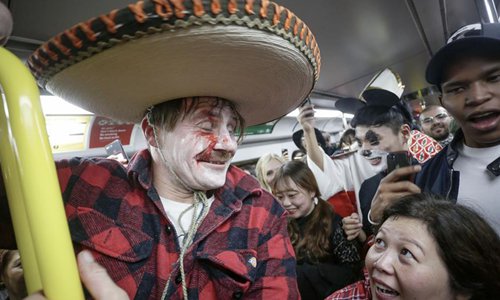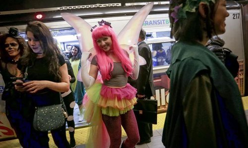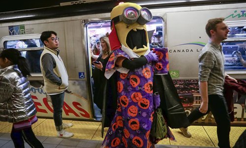 A resident in costume presents the dressing at the subway platform for the annual Halloween Skytrain party in Vancouver, Canada, Oct. 26, 2018. Hundreds of people dressed in costumes take a ride with the Skytrain - Vancouver's public rail transit system to enjoy the annual Halloween themed flash mob party. (Xinhua/Liang Sen)