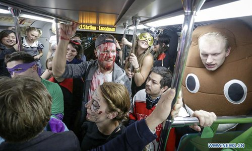 Costumed participants take a train ride during the annual Halloween Skytrain party in Vancouver, Canada, Oct. 26, 2018. Hundreds of people dressed in costumes take a ride with the Skytrain - Vancouver's public rail transit system to enjoy the annual Halloween themed flash mob party. (Xinhua/Liang Sen)